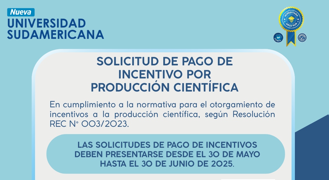 Para dar cumplimiento a la normativa para el otorgamiento de incentivos a la producción científica, según Resolución REC N° 003/2023, La Dirección de Investigación informa que está abierta el período para la solicitud de pago de incentivos a la producción científica 2025. El plazo límite para presentar solicitudes será desde el 30 de mayo al 30 de junio de 2025.