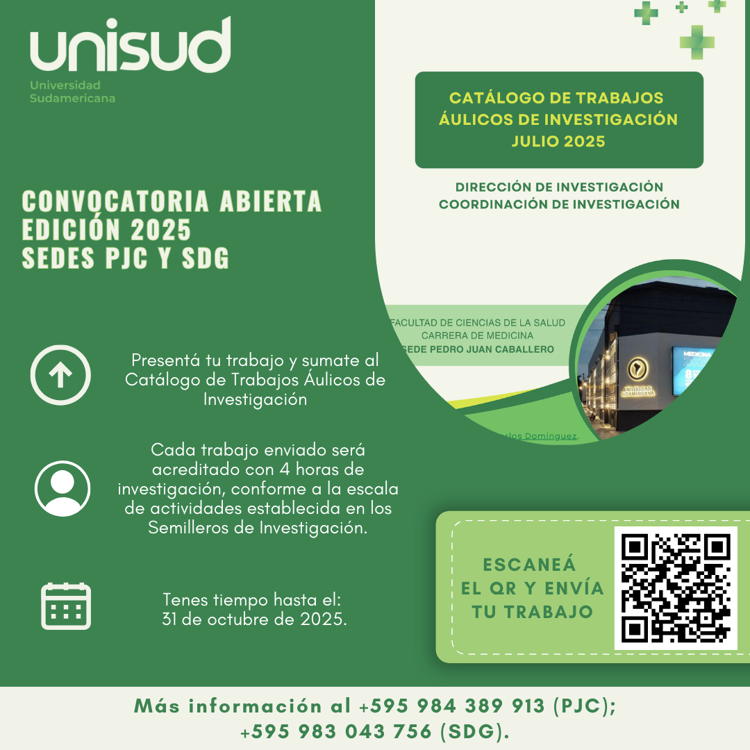 La Dirección de Investigación de la Universidad Sudamericana invita a todos los estudiantes a participar en la Segunda Edición 2025 del Catálogo de Trabajos Áulicos de Investigación, una iniciativa que busca dar visibilidad y reconocimiento a las producciones científicas desarrolladas en el marco de las diferentes asignaturas.