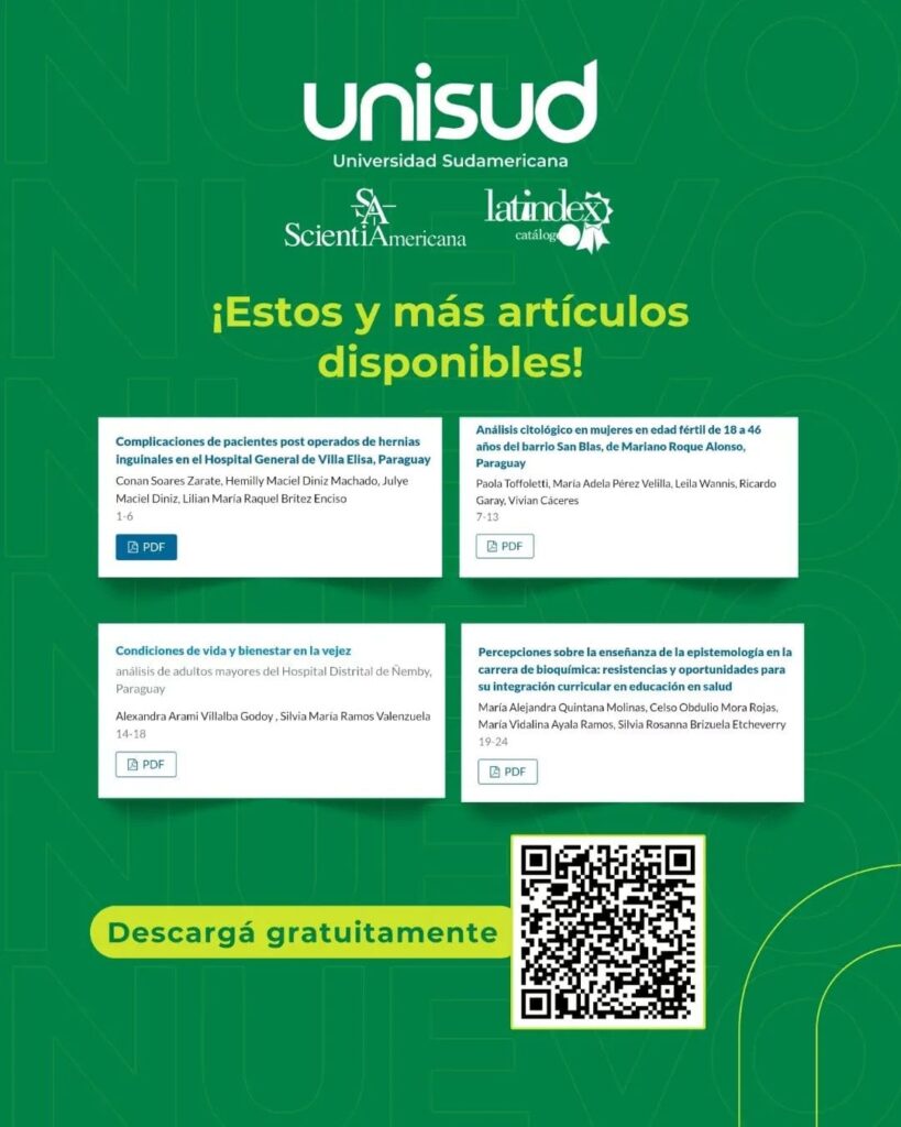 - “Percepciones sobre la enseñanza de la epistemología en la carrera de bioquímica: resistencias y oportunidades para su integración curricular en educación en salud”, de autoría de María Alejandra Quintana Molinas, Celso Obdulio Mora Rojas, María Vidalina Ayala Ramos y Silvia Rosanna Brizuela Etcheverry. Este estudio analiza las percepciones de docentes y profesionales sobre la enseñanza de la epistemología y su aporte al pensamiento crítico en carreras biomédicas.