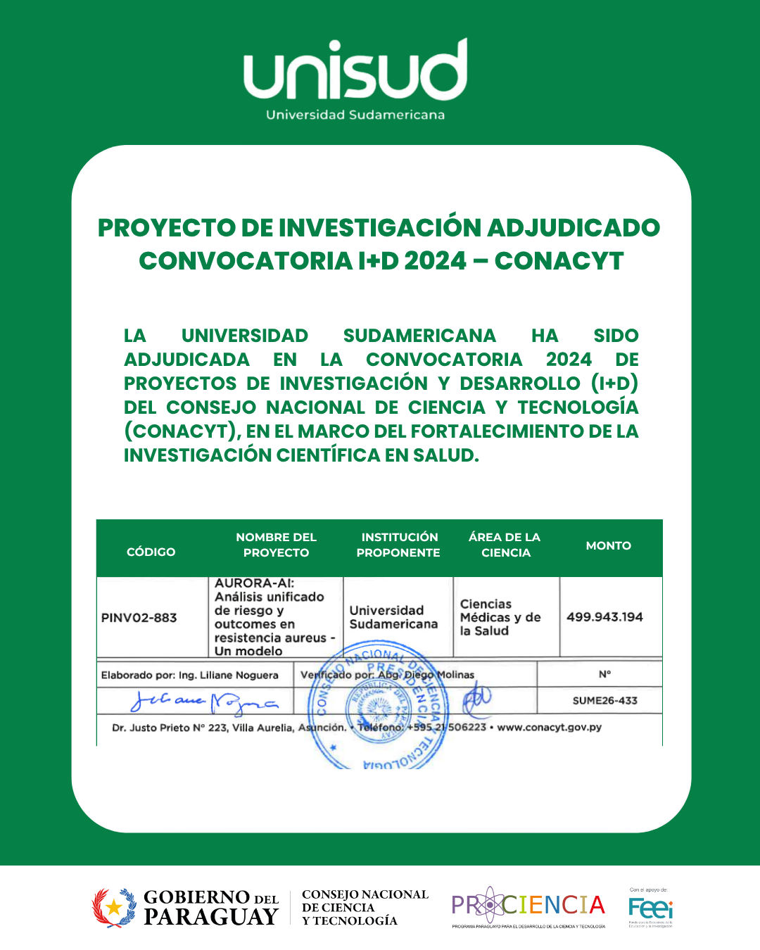 La Universidad Sudamericana ha sido adjudicada en la Convocatoria 2024 de Proyectos de Investigación y Desarrollo (I+D) del Consejo Nacional de Ciencia y Tecnología (CONACYT), en el marco del fortalecimiento de la investigación científica en el área de las ciencias médicas y de la salud.